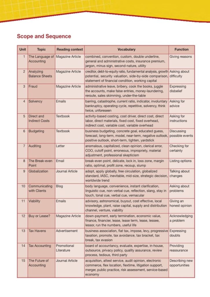 Reviewed by accounting professionals, the course incorporates career-specific vocabulary and contexts into lessons that build students’ working knowledge of English.