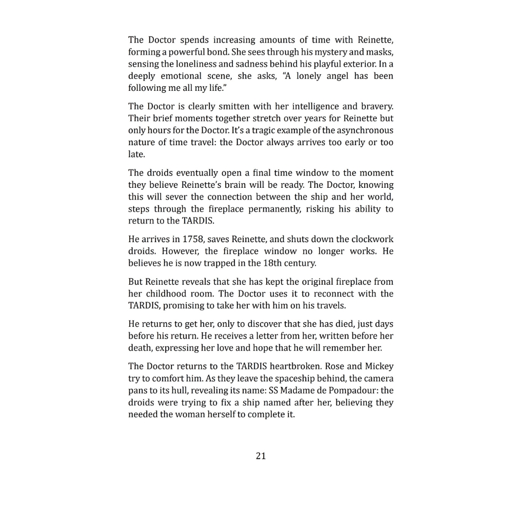 It covers from his explosive debut in The Christmas Invasion to his poignant farewell in The End of Time. The book explores the Tenth Doctor’s relationships with Rose Tyler, Martha Jones, Donna Noble, and beyond: as well as his confrontations with iconic foes like the Master, the Daleks, and the Weeping Angels.