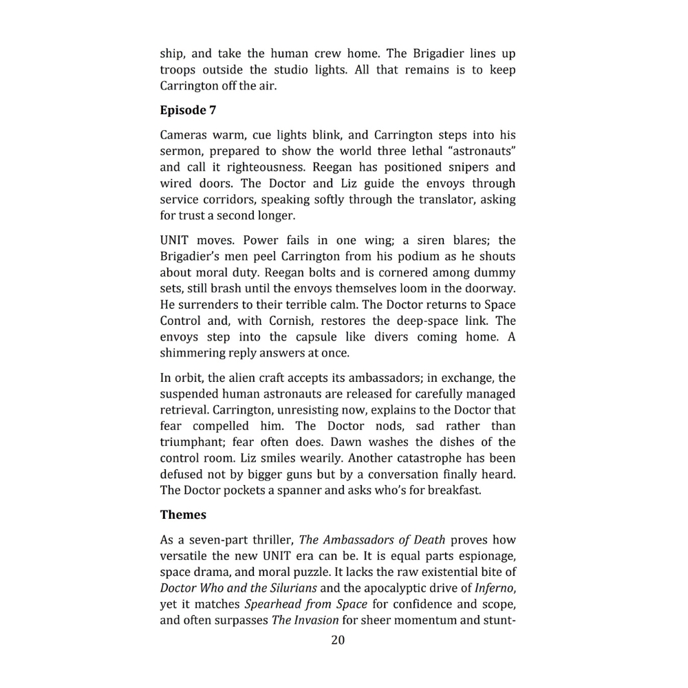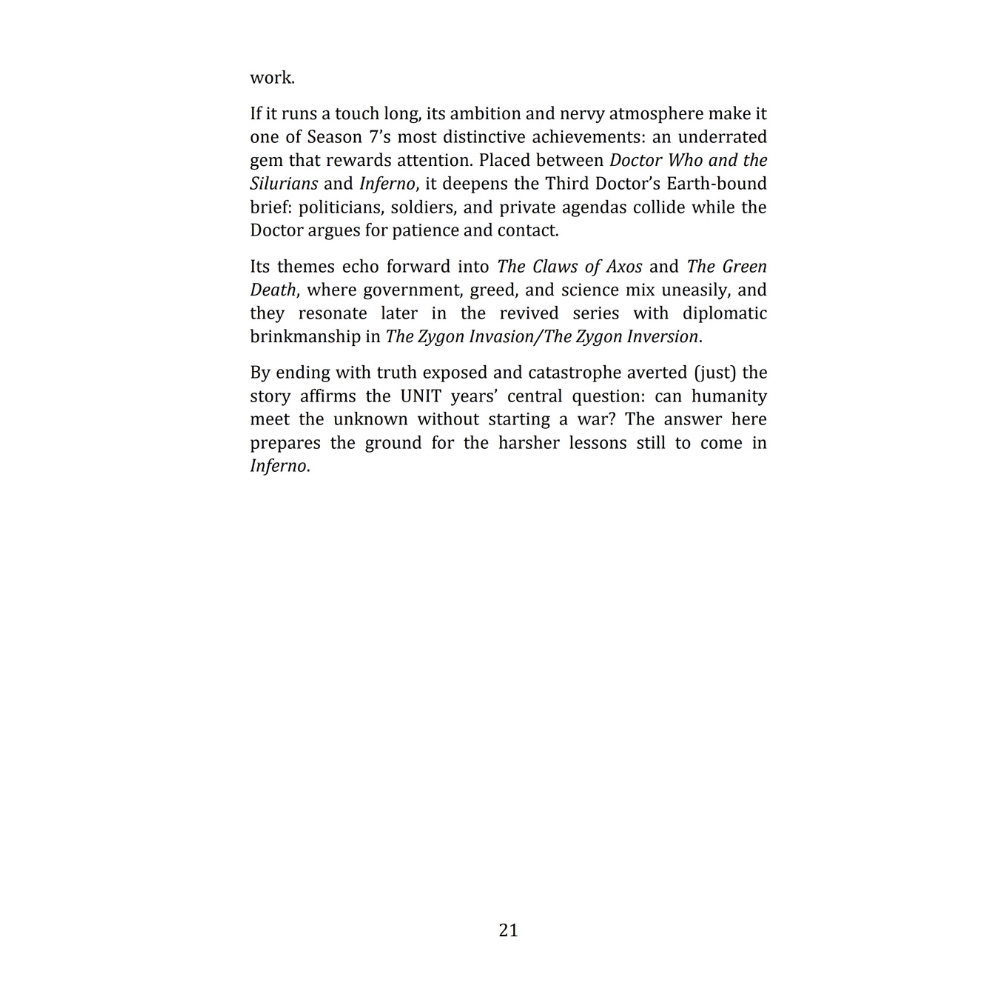 Inside this comprehensive episode-by-episode companion, you’ll find: Detailed synopses and behind-the-scenes insights for each story; Key character developments and returning villains like the Master, the Silurians, and the Daleks; Commentary on themes, production, and the evolving nature of the show during the early 1970s; and A celebration of Jon Pertwee’s legacy and his lasting impact on the Doctor Who universe.