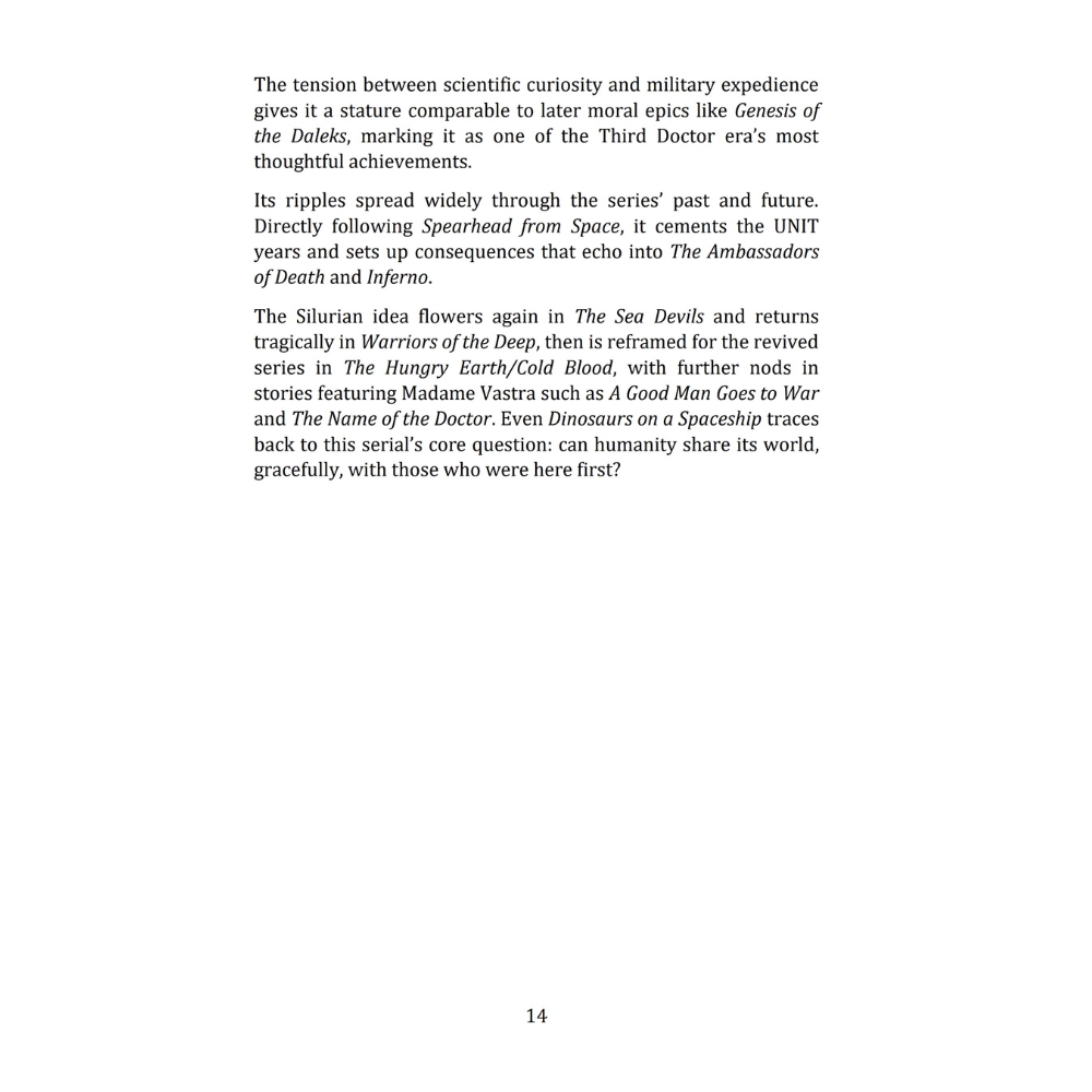 Inside this comprehensive episode-by-episode companion, you’ll find: Detailed synopses and behind-the-scenes insights for each story; Key character developments and returning villains like the Master, the Silurians, and the Daleks; Commentary on themes, production, and the evolving nature of the show during the early 1970s; and A celebration of Jon Pertwee’s legacy and his lasting impact on the Doctor Who universe.